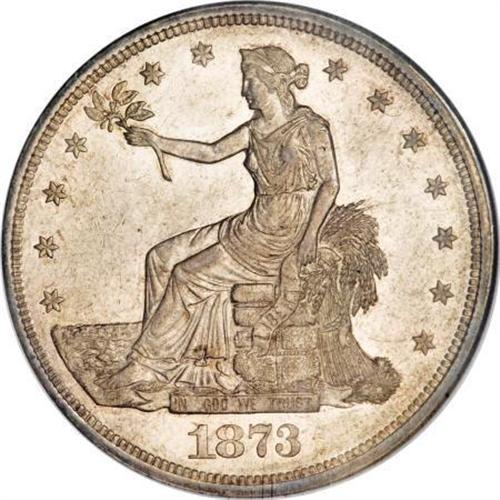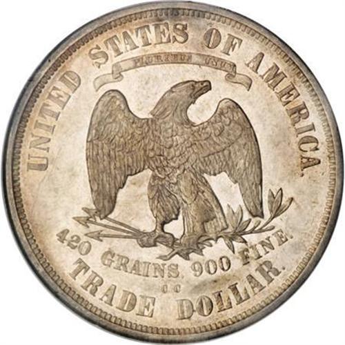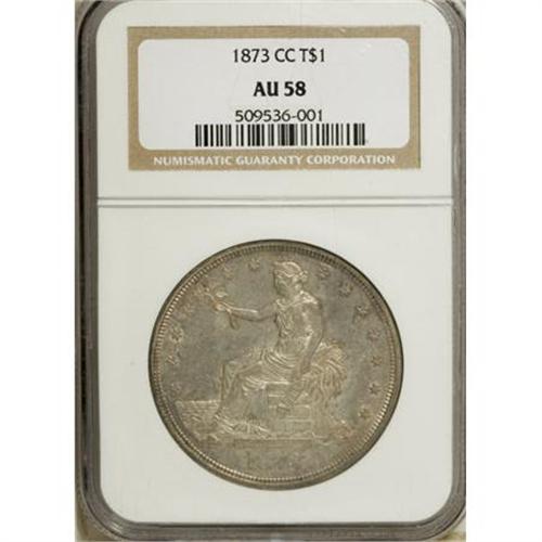 <B>1873-CC T$1 AU58 NGC.</B></I> The 1873-CC Trade dollar saw a low mintage of only 124,500 coins. According to Dave Bowers (2006), "the first 2,580 pieces were released to local depositors on July 23, 1873." The balance of the scant mintage of 1873-CC dollars was exported to China and, as evidenced by the limited availability of Mint State examples today, very few returned home. A veneer of golden-gray patina bathes both sides of this near-Mint example, each of which retains ample luster. A few minuscule marks do not detract. Well struck, save for the usual softness on the eagle's left (right facing) leg.<BR><I>From The Queller Family Collection of Silver Dollars.</B></I><BR><BR><B>Coin Engraver:</B> William Barber<BR><BR><b>Shipping:</b> Coins & Currency (<a target="_blank" href="http://www.heritageauctions.com/common/shipping.php">view shipping information</a>)