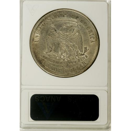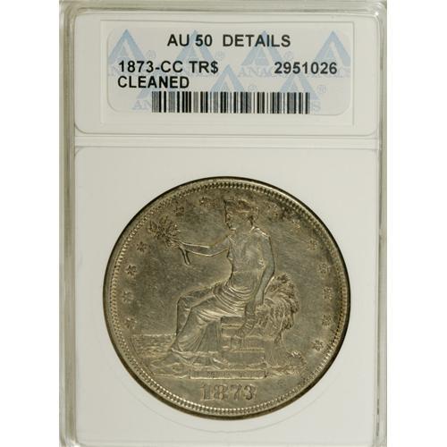 <B>1873-CC T$1 --Cleaned--ANACS. AU50 Details.</B></I> Light tan and ice-blue toning visits this partly lustrous semi-key Carson City Trade dollar. Richly detailed but moderately hairlined; a small rim ding is noted at 5 o'clock on the reverse.<BR><BR><b>Shipping:</b> Coins & Currency (<a target="_blank" href="http://www.heritageauctions.com/common/shipping.php">view shipping information</a>)