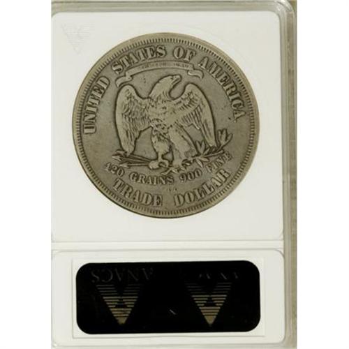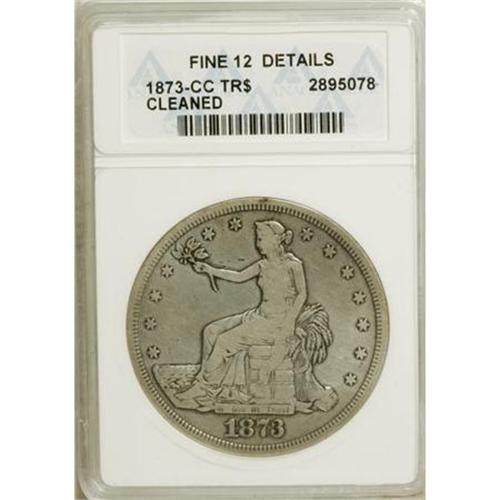 <B>1873-CC T$1 --Cleaned--ANACS. Fine 12 Details.</B></I> NGC Census: (1/98). PCGS Population (0/161). Mintage: 124,500. Numismedia Wsl. Price for NGC/PCGS coin in F12: $240. (#7032)<BR><BR><B>Coin Engraver:</B> William Barber<BR><BR><b>Shipping:</b> Coins & Currency (<a target="_blank" href="http://www.heritageauctions.com/common/shipping.php">view shipping information</a>)
