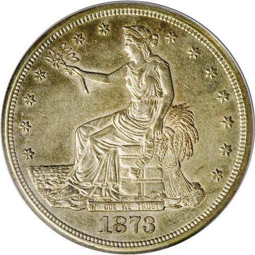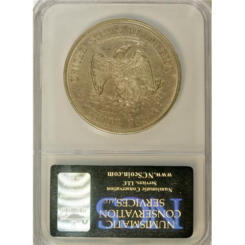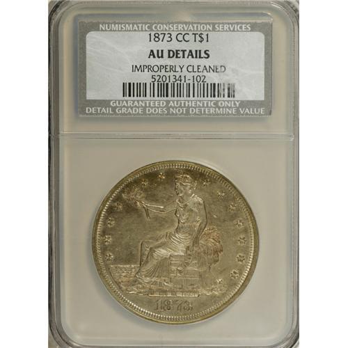 <B>1873-CC T$1 --Improperly Cleaned--NCS. AU Details.</B></I> A boldly detailed example of this key Carson City issue. The surfaces are glossy, and the light lime and peach toning appears unnatural, but there are relatively few marks. A cluster of die lines at 5:30 on the reverse are of mint origin. 1873-CC Seated dollars were also struck during this transitional year.<BR><BR><b>Shipping:</b> Coins & Currency (<a target="_blank" href="http://www.heritageauctions.com/common/shipping.php">view shipping information</a>)