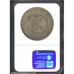 1873-CC T$1 MS61 NGC. The Carson City Mint inaugurated Trade Dollar production in 1873 with a rather stingy delivery of 124,500 coins. Like its similarly dated P-mint counterpart, the '73-CC appears to have seen widespread use in the Orient. Even had a decent number of coins been retained in the United States, the number of Mint State survivors in today's market would still be small. There was virtually no interest in collecting branch mint coins in the 1870s, particularly on the frontier. Inasmuch as the surfaces are free of sizeable or singularly distracting abrasions, this is an uncommonly attractive coin for the MS61 level of preservation. True, the obverse field is a little scuffy with wispy abrasions, but the overall bold strike and rich, original, copper-gray toning more than compensates for this feature. Warm apricot and lilac-blue undertones glisten at direct angles. Population: 3 in 61, 17 finer (7/02).From the Andy Geosits Collection of Trade Dollars. Important notice: We expect to be auctioning lots at the rate of 200-250 per hour. Sometimes eBay Premier live bid software cannot keep up with that pace, so we strongly recommend that you place a realistic proxy bid now as insurance to avoid disappointment. Also please note that all Heritage/CAA lots purchased through eBay Premier carry a 20% Buyer's Premium. Please make sure you read the Terms and Conditions.
