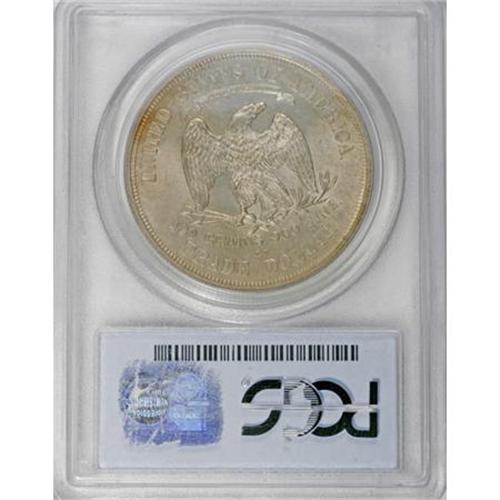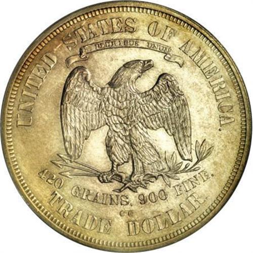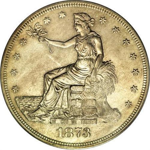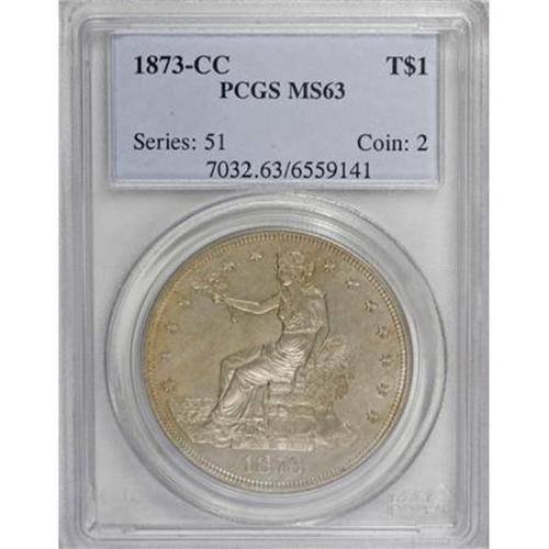 <B>1873-CC T$1 MS63 PCGS.</B></I> The 1873-CC Trade dollar saw a low mintage of only 124,500 coins, second only to the classic 1878-CC. According to Dave Bowers in his <I>Silver Dollars and Trade Dollars of the United States</B></I>, third edition (2006), the "first 2,580 pieces were released to local depositors on July 23, 1873." The balance of the scant mintage of 1873-CC dollars were exported to China and, as evinced by the limited availability of Uncirculated examples today, very few made the journey unharmed. <BR> Attractive olive-gold patination slightly subdues the cartwheel luster, more so on the obverse. However, the razor-sharp details and distraction-free surfaces throughout seem to suggest a higher grade. For the specialist, the reverse die used to strike this coin is distinguishable by the position of the mintmark and, more interestingly, by a small engraver's mark that bisects the top of the D in DOLLAR. We anticipate aggressive bidding activity on this conservatively graded 1873-CC dollar. Population: 10 in 63, 5 finer (12/07).<BR><I>From The Rare Coins of New Hampshire Collector Set.</B></I><BR><BR><B>Coin Engraver:</B> William Barber<BR><BR><b>Shipping:</b> Coins & Currency (<a target="_blank" href="http://www.heritageauctions.com/common/shipping.php">view shipping information</a>)