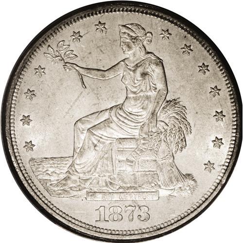 <B>1873-CC T$1 MS64 PCGS.</B></I> The year 1873 is among the most notable in the annals of U.S. numismatics. The Coinage Act of 1873 (a.k.a. The "Crime of '73") legislated out of existence the two cent piece, the three cent silver, and the half dime. It omitted the (Liberty Seated design) silver dollar from the list of authorized coins while introducing the silver Trade dollar, slightly increased the silver content of minor coinage (signified by the 1873-74 With Arrows silver coin subtypes), and effectively bound the United States to the gold standard. Like so many U.S. numismatic issues that began with a bang, the two cent, silver trime, and half dime ended with a whimper with the issuance of the Closed 3 proof-only two and three cents, while the half dime saw a moderate business-strike issue.<BR> The average spot price of silver, after peaking near the end of the Civil War in 1864 at almost $3/ounce, began a long-term slide. In 1870 the average price (London fix) was $1.43/ounce; by 1880 it was $1.12. The 1890s and 1900s brought further price collapses (with a couple of temporary spikes) to well below $1.00/ounce, a price range that persisted until 1967. A chief source of the long-term slide in silver prices was the Comstock Lode. The rich veins of Nevada silver were discovered in 1859, but lode production peaked in 1876 through 1878, when silver ore worth roughly $36 million was extracted annually. Silver prices were further destabilized in the late 19th century by the widespread shift of many nations from a silver standard to a gold standard. Germany adopted gold as its standard in 1871-73 (releasing 8,000 tons of silver onto the world market) and the Latin Monetary Union (France, Italy, Belgium, and Switzerland) did so in 1873-74. The Scandinavian Union (Denmark, Norway, and Sweden) and The Netherlands followed suit in 1875-76. By the final decades of the 19th century, silver dominated only in the Far East, especially China.<BR> The Carson City Mint managed to eke out 2,300 examples of the Seated Liberty dollar and coined 124,500 Trade dollars in 1873, most of which were shipped immediately to the Orient. This date--despite having the lowest mintage of any business strike Trade dollar, with the sole exception of the 1878-CC--enjoyed virtually no demand or collector interest until the 1950s, after which the issue saw rapidly escalating prices as collectors began to finally recognize its rarity. The present MS64 example is one of four coins so graded at PCGS, with one finer (11/06).<BR> The 1873-CC is a well-known condition rarity in the Trade dollar series, especially in mint condition. This is a particularly well struck example that has frosted mint luster over surfaces that are primarily gray-brilliant with a bit of light golden on each side. A few unobtrusive, small field marks are scattered over each side, the only abrasion that might prove to be useful for pedigree purposes is located just above the A in TRADE on the lower reverse.<BR><BR><b>Shipping:</b> Coin/Currency (<a target="_blank" href="http://www.heritageauctions.com/common/shipping.php">view shipping information</a>)