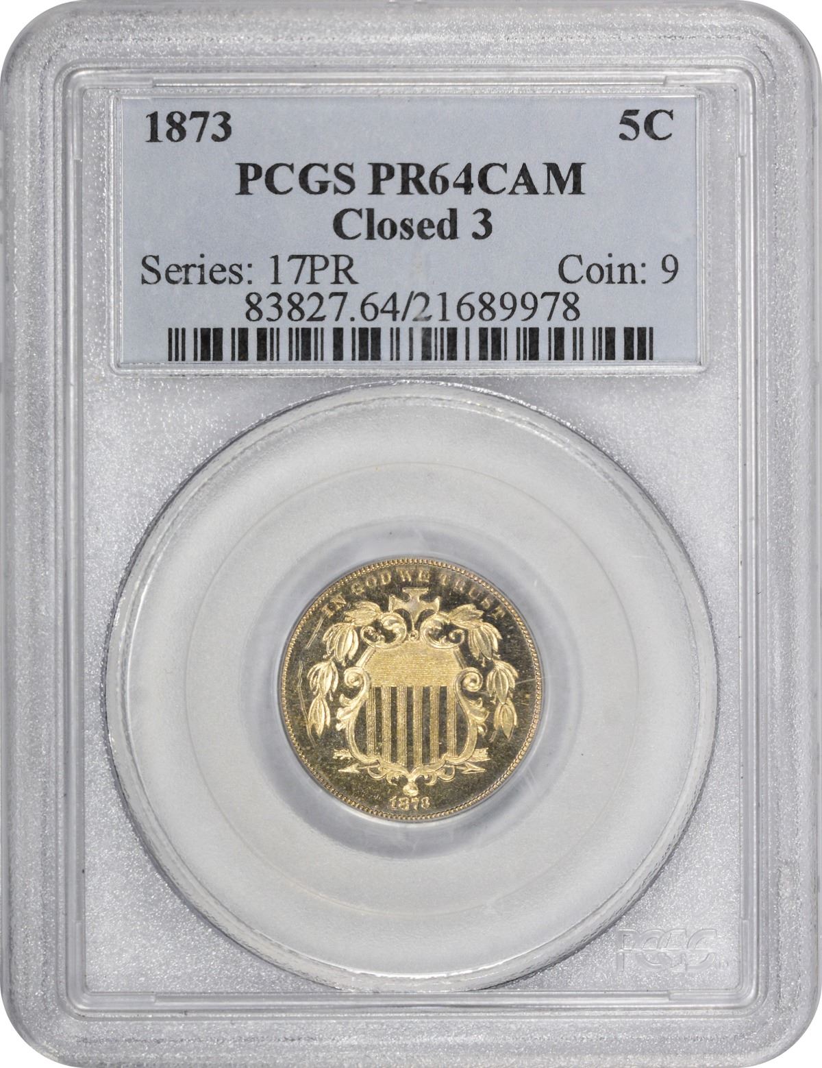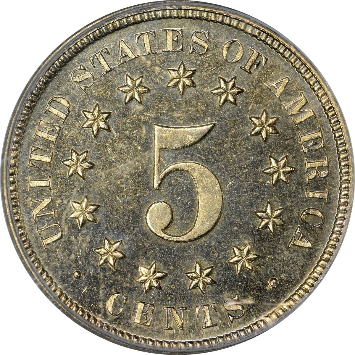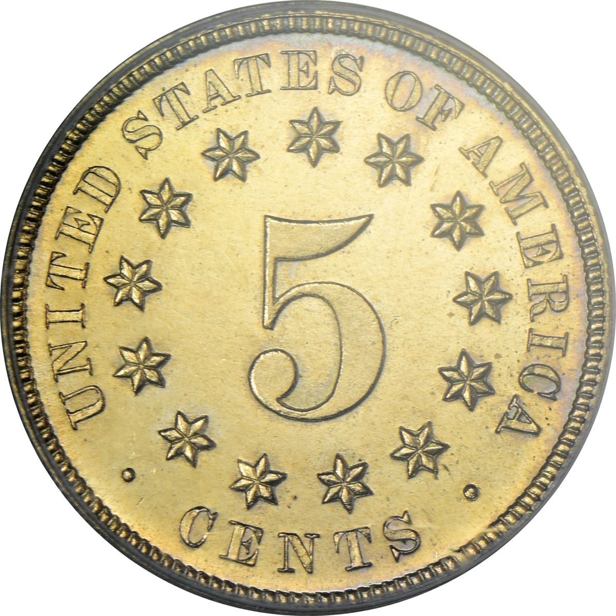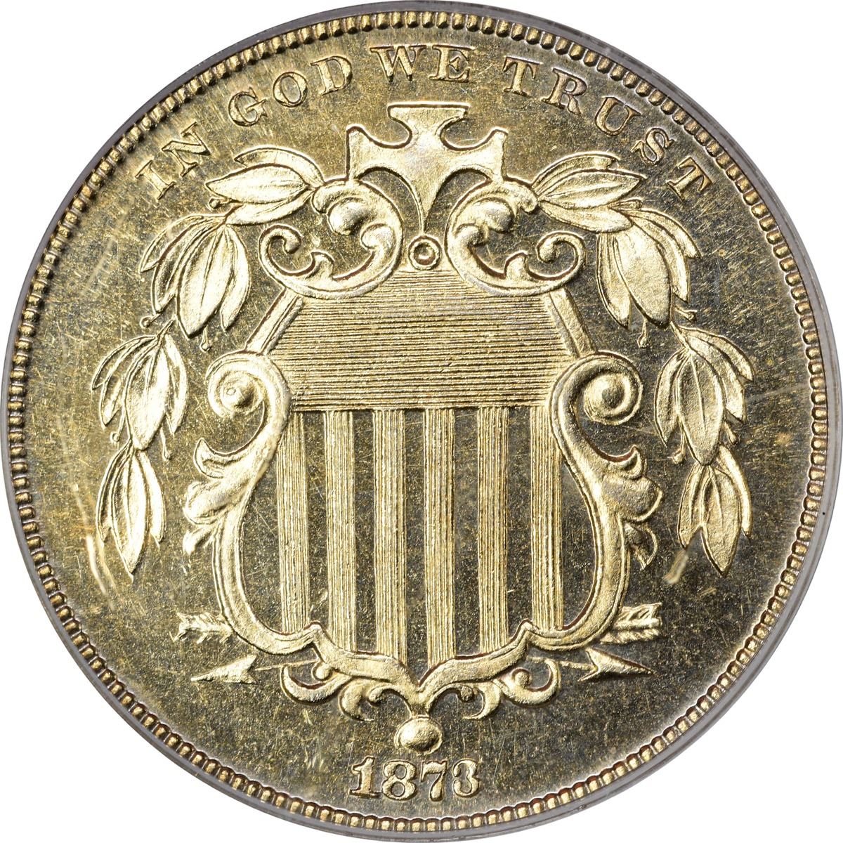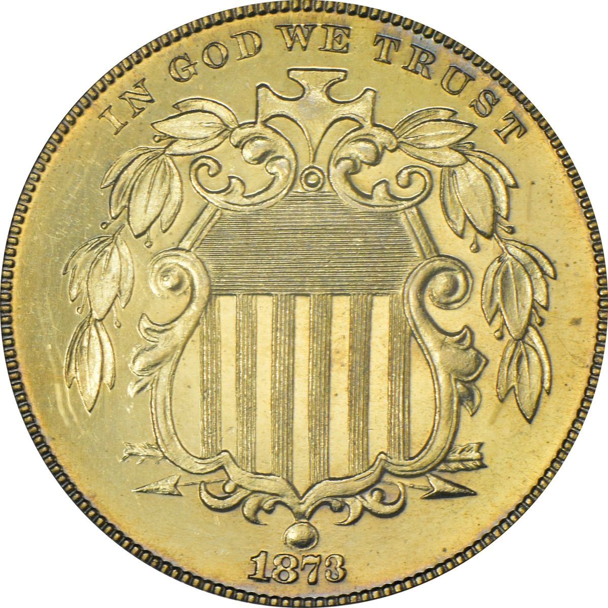 An impressive gem at all levels, this appealing specimen exhibits frosty motifs and mirror fields all beneath a sheen of pale golden iridescence. Reverse die rotated something just shy of 180°. Boldly struck and a pleasure to behold.