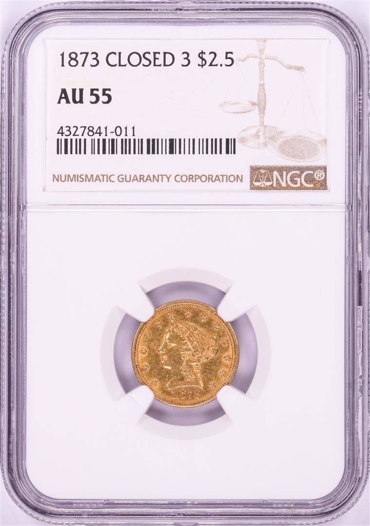 One 1873 Closed 3 $2 1/2 Liberty Head Quarter Eagle Gold Coin NGC AU55. NGC Certified.