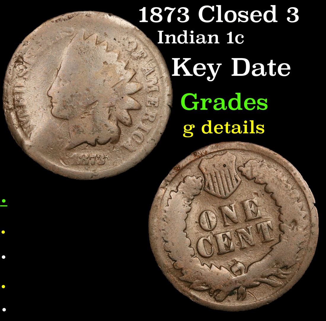 1873 Closed 3 Key Date . Indian Cent 1c Grades g details.