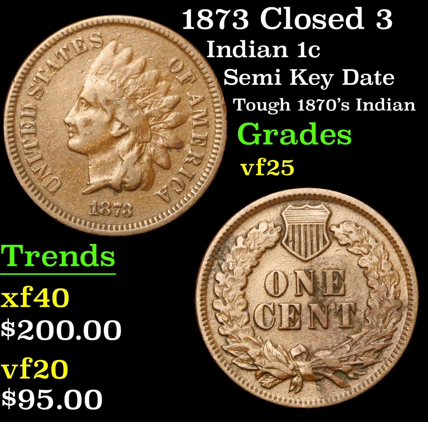 1873 Closed 3 Indian Cent 1c Grades vf+. Semi Key Date; Tough 1870's Indian