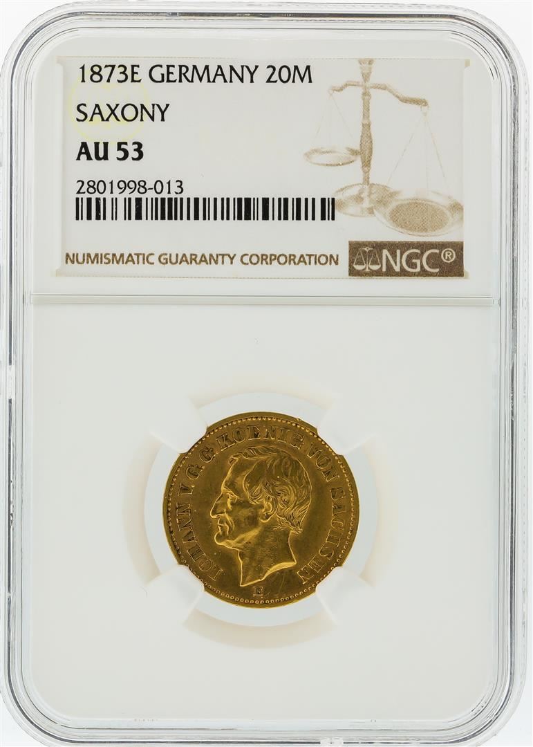 One 1873-E NGC AU53 Germany 20M Saxony Gold Coin. NGC Certified.