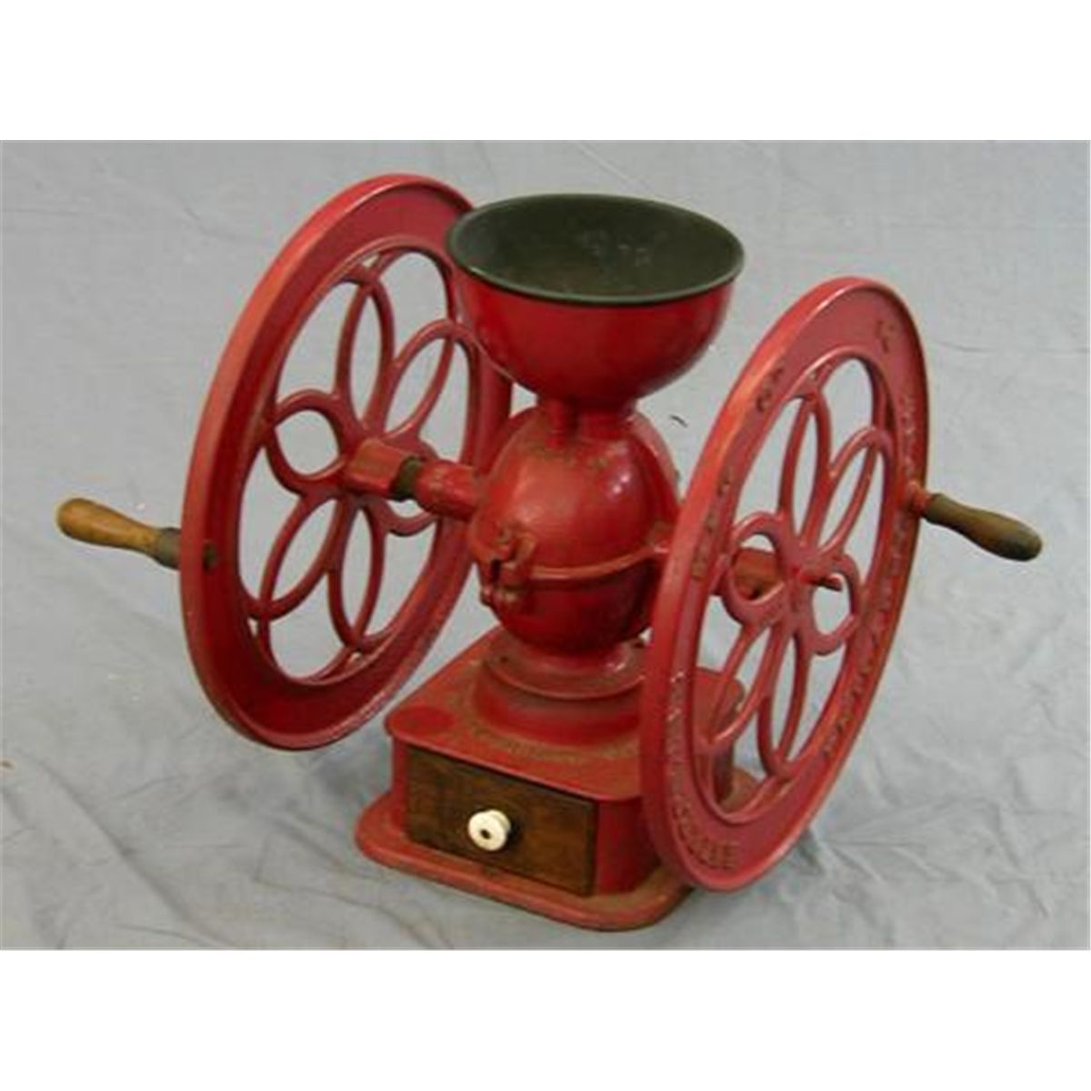 1873 ENTERPRISE COFFEE GRINDER; Large Cast Iron General Store Double Wheel Coffee Grinder, 19th c., by Enterprise Mfg. CO., Philadelphia, H.- 20 1/2 in., W.- 16 3/4 in., D.- 19 1/2 in. MWF144