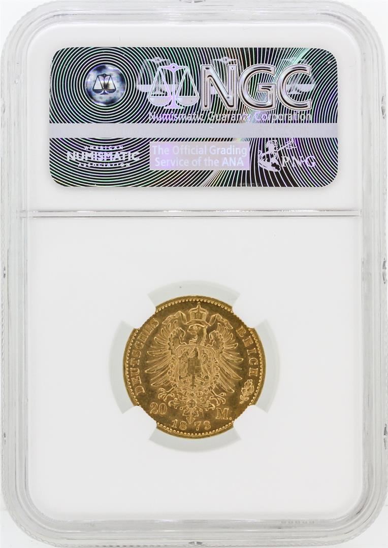 One 1873-F NGC AU55 Germany 20M Wurttemberg Gold Coin. NGC Certified.