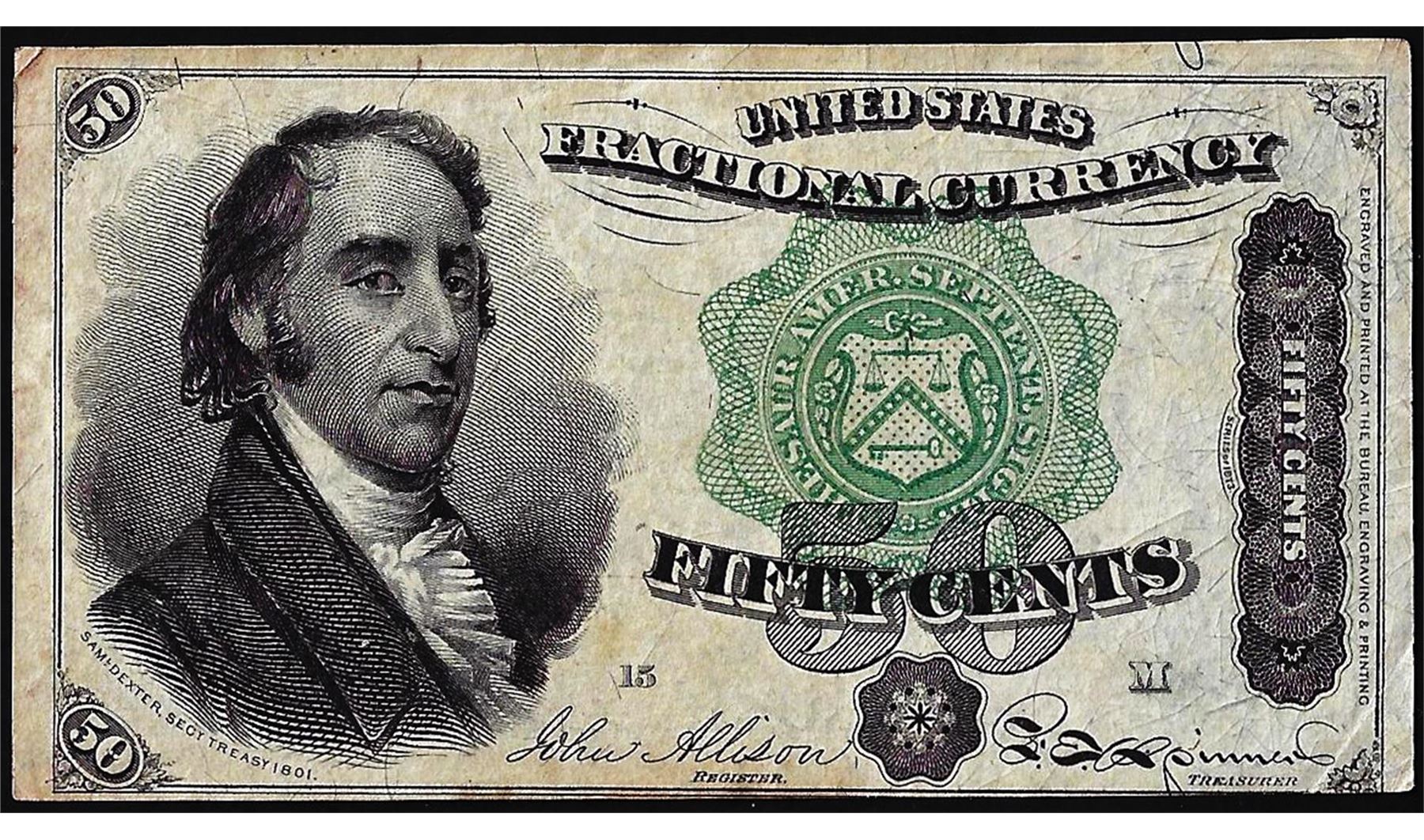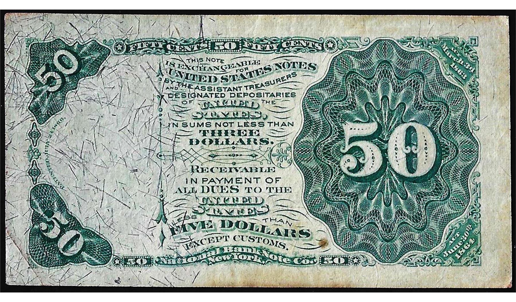 One 1873 Fifty Cents Fourth Issue Fractional Currency Note.
