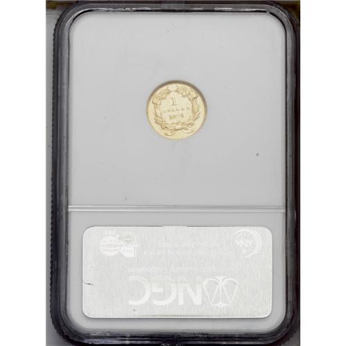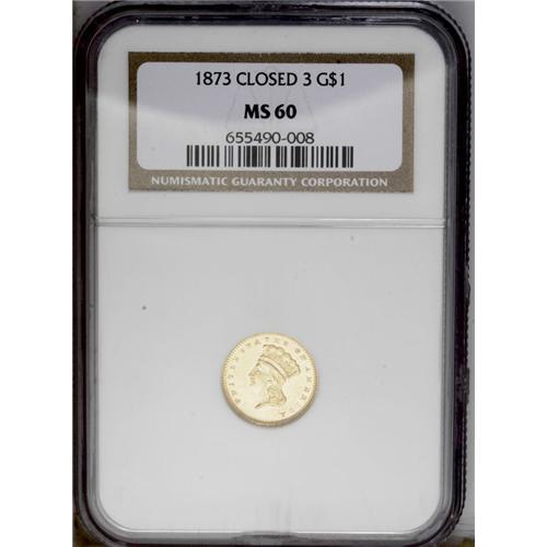 <B>1873<G$1> Closed 3 MS60 NGC.</B></I> Bright surfaces are enveloped with yellow-gold coloration. Wispy handling marks are noted on both sides. The design elements are generally well impressed, except that most of the letters in LIBERTY are very faint. <BR><BR><B>Important notice
