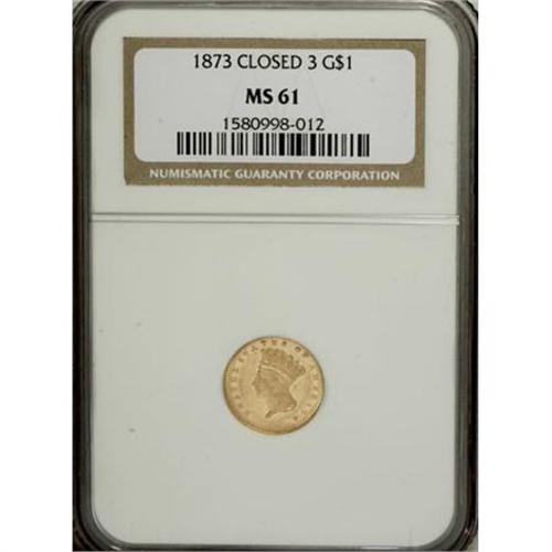 <B>1873 G$1 Closed 3 MS61 NGC.</B></I> Well struck save for a few central reverse letters. Marks are moderate for the grade. The bold vertical die scratch on the neck is as made, and diagnostic for this rare issue. Only 1,800 business strikes fell from the dies, along with 25 proofs. Date collectors can take solace from the Open 3 variety, which is plentiful.<BR><BR><B>Coin Engraver:</B> James B. Longacre<BR><BR><b>Shipping:</b> Coins & Currency (<a target="_blank" href="http://www.heritageauctions.com/common/shipping.php">view shipping information</a>)