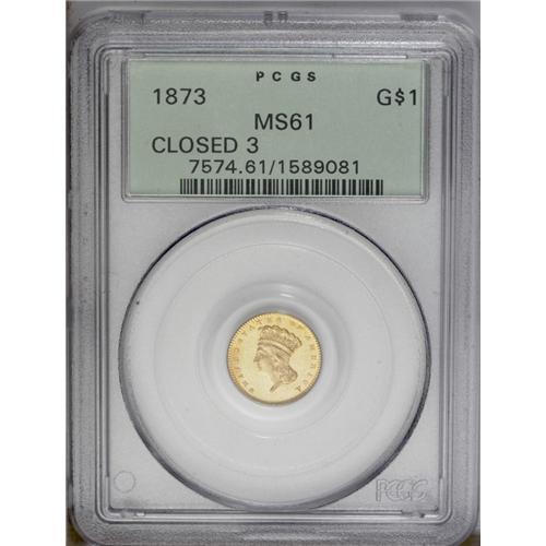 <B>1873<G$1> Closed 3 MS61 PCGS.</B></I> The 1873 Open 3 gold dollar is relatively plentiful, but its Closed 3 counterpart is rare. Of the latter, only 1,800 pieces were struck. The Closed 3 strongly resembles an 8, and it is little wonder that the date logotype was shortly modified. This crisply struck and unblemished piece has a faint LIBERTY, as made. Population: 7 in 61, 27 finer (4/06).