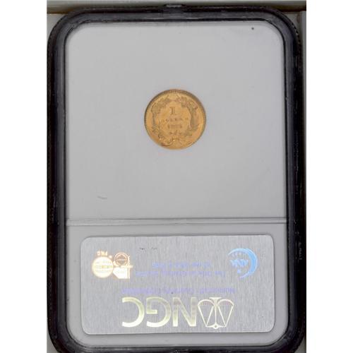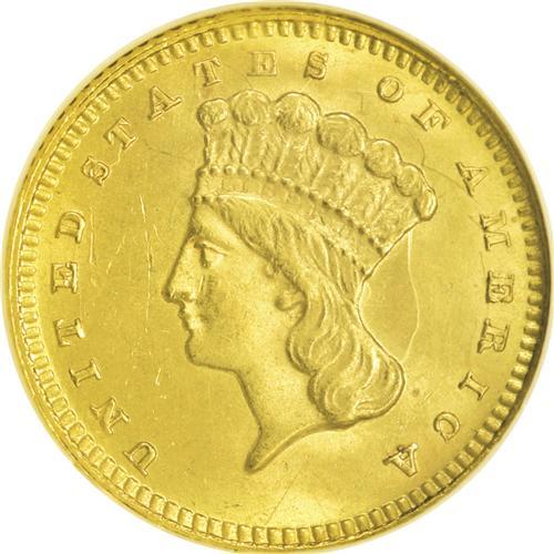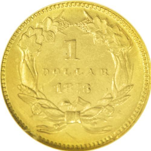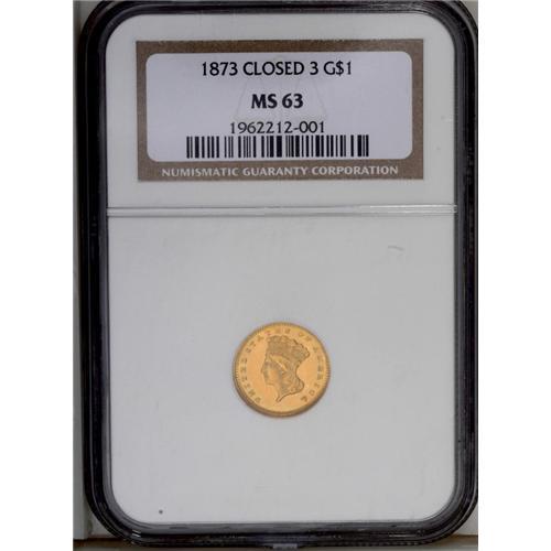 <B>1873<G$1> Closed 3 MS63 NGC.</B></I> The obverse displays pleasing cartwheel luster, while the reverse is decidedly prooflike. Most likely, the reverse die was polished by mint personnel to remove clash marks, which are absent on the reverse but prominent on the obverse. Well struck aside from the date. Moderate reverse abrasions are seen near DOLLAR and the left ribbon end. The <I>Guide Book</B></I> reports a tiny mintage of 1,800 pieces. Census: 7 in 63, 10 finer (7/06).