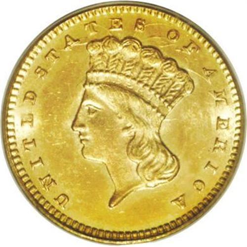 <B>1873<G$1> Closed 3 MS63 PCGS.</B></I> Out of a mere 1,800 business strikes produced of this underappreciated gold dollar, perhaps as few as 50 to 60 examples survive in all grades. The surfaces on this flashy, well preserved coin are boldly defined, even on the often-weak digits of the date, and display semi-prooflike luster throughout. Unlike some Open and Closed varieties from this year, there is no mistaking which this one is. In fact, without close examination one would think this to be an 1878--the very reason the Open 3 coins were later produced. Population: 7 in 63, 10 finer (4/06).