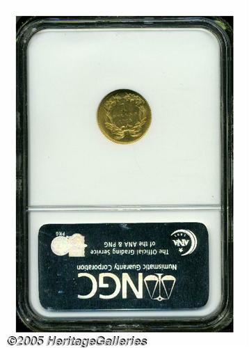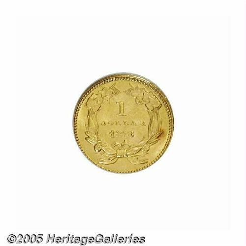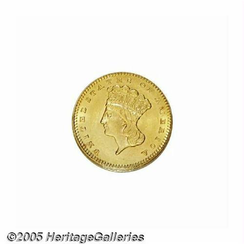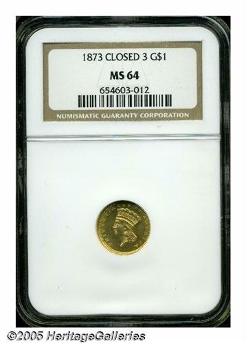 <B>1873<G$1> Closed 3 MS64 NGC.</B></I> The 1873 Closed 3 is among the scarcest issues in the Gold Dollar series and certainly one of the most underpublicized. Of the 1,800 business strikes minted, fewer than 100 pieces are estimated to be extant in all grades. On some denominations the distinction between the Open 3 and Closed 3 variants is not too obvious, but there is no mistaking the two varieties on the Gold Dollar. In fact, without close examination one would think this to be an 1878--the very reason the Open 3 coins were later produced. This Choice example is rather satiny in appearance with rich golden color and wispy die clashing surrounding the portrait. At least a portion of the 87 in the date is ill-defined, like nearly all seen.