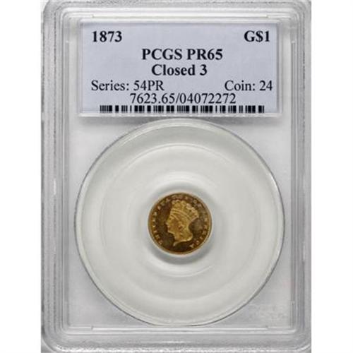 <B>1873 G$1 Closed 3 PR65 PCGS.</B></I> A sharply struck lemon-orange Gem proof from the Trompeter Collection with flashy, reflective fields and exceptional eye appeal. Essentially pristine, although an occasional minute planchet flaw (as made) is encountered. At one time, PCGS had incorrectly certified this specimen as MS65. Population: 2 in 65, 1 finer (1/08).<BR><I>Ex: Ed Trompeter Collection (Superior, 2/92), lot 19; Orlando Sale (Superior, 8/92), lot 541; Superior (5/94), lot 1438; Long Beach Bullet Sale (Heritage, 9/96), lot 572; Heritage (11/04), lot 8059, as PCGS MS65.</B></I><BR><I>From The Southwest Collection.</B></I><BR><BR><B>Coin Engraver:</B> James B. Longacre<BR><BR><b>Shipping:</b> Coins & Currency (<a target="_blank" href="http://www.heritageauctions.com/common/shipping.php">view shipping information</a>)