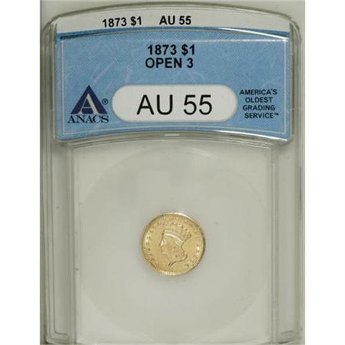 <B>1873 G$1 Open 3 AU55 ANACS.</B></I> NGC Census: (8/1471). PCGS Population (65/1318). Mintage: 123,300. Numismedia Wsl. Price for NGC/PCGS coin in AU55: $178. (#7573)<BR><BR><b>Shipping:</b> Coins & Currency (<a target="_blank" href="http://www.heritageauctions.com/common/shipping.php">view shipping information</a>)