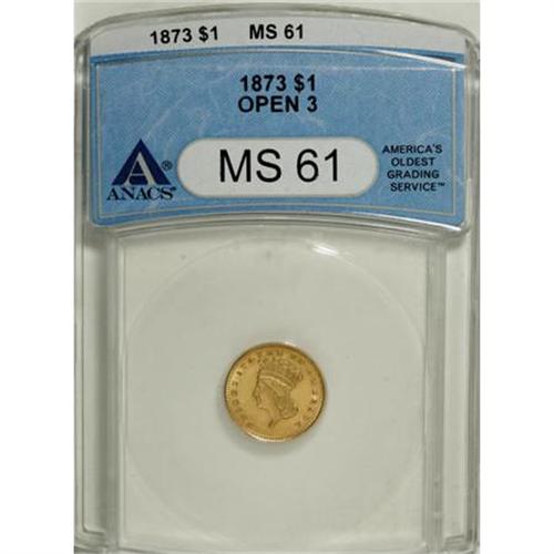 <B>1873 G$1 Open 3 MS61 ANACS.</B></I> NGC Census: (297/1069). PCGS Population (192/938). Mintage: 123,300. Numismedia Wsl. Price for NGC/PCGS coin in MS61: $313. (#7573)<BR><BR><B>Coin Engraver:</B> James B. Longacre<BR><BR><b>Shipping:</b> Coins & Currency (<a target="_blank" href="http://www.heritageauctions.com/common/shipping.php">view shipping information</a>)