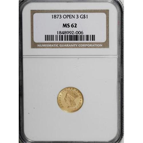<B>1873 G$1 Open 3 MS62 NGC.</B></I> NGC Census: (538/517). PCGS Population (412/512). Mintage: 123,300. Numismedia Wsl. Price for NGC/PCGS coin in MS62: $365. (#7573)<BR><BR><B>Coin Engraver:</B> James B. Longacre<BR><BR><b>Shipping:</b> Coins & Currency (<a target="_blank" href="http://www.heritageauctions.com/common/shipping.php">view shipping information</a>\)