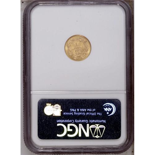 <B>1873<G$1> Open 3 MS63 NGC.</B></I> Well struck aside from the C in AMERICA, which is often indistinct on Type Three gold dollars. A well struck and beautiful tawny-gold example.