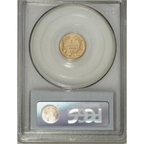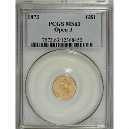<B>1873 G$1 Open 3 MS63 PCGS.</B></I> The lustrous yellow-gold surfaces of this Select gold dollar exhibit well struck design elements, and display some prooflike characteristics. Some minor handling marks define the grade.<BR><BR><B>Coin Engraver:</B> James B. Longacre<BR><BR><b>Shipping:</b> Coins & Currency (<a target="_blank" href="http://www.heritageauctions.com/common/shipping.php">view shipping information</a>)