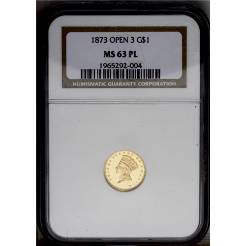 <B>1873<G$1> Open 3 MS63 Prooflike NGC.</B></I> Impressively mirrored fields and a penetrating strike provide outstanding eye appeal for the grade. Only the C in AMERICA is not boldly struck. Census: 5 in 63 Prooflike, 0 finer (2/06).