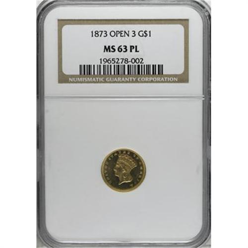 <B>1873 G$1 Open 3 MS63 Prooflike NGC.</B></I> A carefully preserved and nicely mirrored canary-gold piece. Only the C in AMERICA lacks sharp definition. This issue is rarely seen in Prooflike condition, as attested to by the NGC population data. Census: 7 in 63 Prooflike, 0 finer (7/07). 3<BR><BR><B>Coin Engraver:</B> James B. Longacre<BR><BR><b>Shipping:</b> Coins & Currency (<a target="_blank" href="http://www.heritageauctions.com/common/shipping.php">view shipping information</a>)