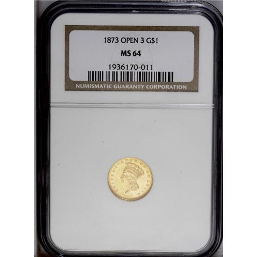 <B>1873<G$1> Open 3 MS64 NGC.</B></I> A highly reflective example of the more common issue of 1873. Well detailed with only a few small marks on the gleaming gold surfaces.<BR><I>From The Derrick Snider Collection.</B></I>