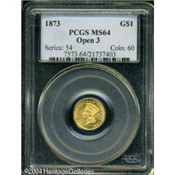 1873 G$1 Open 3 MS64 PCGS. Lustrous surfaces revea <B>1873 G$1 Open 3 MS64 PCGS.</B></I> Lustrous surfaces reveal pleasing yellow-gold color, and the design elements are nicely struck. A couple of minute marks on Liberty's cheek and in the field near the nose limit the grade. <BR><BR><B>Important notice:</B> Heritage usually auctions material at the rate of 200-250 lots per hour. On some occasions eBay Live bid software or the Internet may not be able to keep up with the pace of the auction. We recommend placing a realistic absentee bid now as insurance to avoid disappointment. Occasionally the auctioneer may eliminate or reject an eBay Live bid, and the auctioneer may also reopen a lot after the close of the eBay live bidding (usually because we missed an audience bid), and may reject your bid even if it shows you as the winning bidder. By bidding via eBay Live, you agree that Heritage may award the lot to another bidder at its sole discretion under the circumstances described above or any other reasonable circumstances. Since eBay bids are not shown to us until we open the lot on the floor, we treat those bids just like floor bids. In most cases the floor responds before the eBay bid is presented to us, due to Internet lag time, so for consistency we have made it a policy that floor bids are always considered first over tie eBay live bids. Also please note that all Heritage lots purchased through eBay Live carry a 20% Buyer's Premium. Please make sure you read the Terms and Conditions before you bid. This lot is being auctioned in conjunction with a live floor auction by Heritage Galleries & Auctioneers. All final auction and invoice information will be supplied by Heritage Galleries & Auctioneers, and all other information should be considered preliminary. Lot:6469