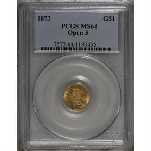 <B>1873 G$1 Open 3 MS64 PCGS.</B></I> NGC Census: (205/47). PCGS Population (173/44). Mintage: 123,300. Numismedia Wsl. Price for NGC/PCGS coin in MS64: $1,265. (#7573)<BR><BR><B>Coin Engraver:</B> James B. Longacre<BR><BR><b>Shipping:</b> Coins & Currency (<a target="_blank" href="http://www.heritageauctions.com/common/shipping.php">view shipping information</a>)