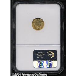 <B>1873<G$1> Open 3 MS65 NGC.</B></I> With smooth, frosty surfaces and pleasing yellow-gold color, this lovely example would fit nicely into a high quality type set. Actually, the commonness of this P-mint issue fades rapidly as one approaches the MS65 threshold, and coins graded that or finer are undeniably rare. The incompleteness of detail over the word LIBERTY on the obverse is diagnostic of many 1873 Open 3 Gold Dollars, however, this does not seem to apply to this specimen with essentially full detail. Identifiable by a horizontal pinscratch in the upper left reverse field to the left of the 1 that is not outwardly distracting. Population: 26 in 65, 8 finer (4/04).<BR><I>Ex: Louisiana N.A., Paramount Sale (5/66), lot 510, where it brought $61.</B></I> <BR><BR><B>Important notice:</B> Heritage usually auctions material at the rate of 200-250 lots per hour. On some occasions eBay Live bid software or the Internet may not be able to keep up with the pace of the auction. We recommend placing a realistic absentee bid now as insurance to avoid disappointment. Occasionally the auctioneer may eliminate or reject an eBay Live bid, and the auctioneer may also reopen a lot after the close of the eBay live bidding (usually because we missed an audience bid), and may reject your bid even if it shows you as the winning bidder. By bidding via eBay Live, you agree that Heritage may award the lot to another bidder at its sole discretion under the circumstances described above or any other reasonable circumstances. Since eBay bids are not shown to us until we open the lot on the floor, we treat those bids just like floor bids. In most cases the floor responds before the eBay bid is presented to us, due to Internet lag time, so for consistency we have made it a policy that floor bids are always considered first over tie eBay live bids. Also please note that all Heritage lots purchased through eBay Live carry a 20% Buyer's Premium. Please make sure you read the Terms and Conditions before you bid.
