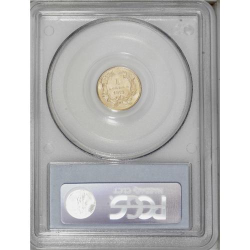 <B>1873<G$1> Open 3 MS65 PCGS.</B></I> Along with the 1874, the 1873 Open 3 is one of the relatively high mintage dates during the latter part of the gold dollar series, and as such often used for type set purposes. This coin is ideal in that regard, as it is a beautiful, highly lustrous, honey gold Gem, in a date that indeed is not often found with such quality. Blessed with a full strike, which is unusual for the date. A few trivial abrasions can be seen, but they do not hinder the eye appeal of this beauty.