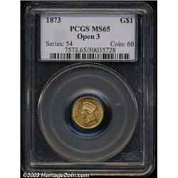 <TABLE cellSpacing=0 cellPadding=0 width="100%" bgColor=#000000 border=0><TBODY><TR><TD width="100%"><TABLE cellSpacing=1 cellPadding=3 width="100%" border=0><TBODY><TR><TD width="100%" bgColor=#79735c><FONT face=arial color=#ffffff size=3><B>Description</B> </FONT></TD></TR><TR><TD width="100%" bgColor=#ffffff><FONT face=arial size=2><B>1873 G$1 Open 3 MS65 PCGS.</B></I> A beautifully preserved Gem with shimmering orange-gold surfaces. Liberty's neck has a bold vertical die line, as made. Well struck aside from the 18 in the date. Population: 29 in 65, 8 finer (8/03). </FONT></TD></TR></TBODY></TABLE></TD></TR></TBODY></TABLE><BR><A name=PricesRealized></A><TABLE cellSpacing=0 cellPadding=0 width="100%" bgColor=#000000 border=0><TBODY><TR><TD width="100%"><TABLE cellSpacing=1 cellPadding=3 width="100%" border=0><TBODY><TR><TD width="100%" bgColor=#79735c><A name=PR><FONT face=arial color=#ffffff size=3><B>Previous Prices from Heritage Auctions</B> </FONT></A></TD></TR><TR><TD bgColor=#f6f6ed><TABLE cellSpacing=0 cellPadding=0 width="100%" border=1><TBODY><TR><TD align=middle width="33%"><B>Date</B></TD><TD align=middle width="33%"><B>Service</B></TD><TD align=middle width="33%"><B>Price</B></TD></TR><TR bgColor=whitesmoke><TD width="33%"><B>05/01/1999</B></TD><TD width="33%">PCGS</TD><TD width="33%">$1,725.00</TD></TR><TR bgColor=whitesmoke><TD width="33%"><B>02/01/2000</B></TD><TD width="33%">NGC</TD><TD width="33%">$1,265.00</TD></TR></TBODY></TABLE></TD></TR><TR><TD bgColor=#ffffff><FONT face=arial size=1 ?>PLEASE NOTE: All prices realized reflect the final hammer price PLUS the buyer's premium in auctions that charge a buyer's premium. Each item has a notation at the top of the listing indicating whether that lot included a buyer's premium. Example: A item that sells with a final hammer price of $100 and a 20% buyer's premium will display with a price realized of $120. All information listed is intended to be as accurate as possible, but errors are possible. Please use this guide carefully and inform us of any inaccuracies. </FONT></TD></TR></TBODY></TABLE></TD></TR></TBODY></TABLE><BR><TABLE cellSpacing=0 cellPadding=0 width="100%" bgColor=#000000 border=0><TBODY><TR><TD width="100%"><TABLE cellSpacing=1 cellPadding=3 width="100%" border=0><TBODY><TR><TD width="100%" bgColor=#79735c colSpan=6><FONT face=arial color=#ffffff size=3><B>Price Guide*</B> </FONT></TD></TR><TR bgColor=#f6f6ed><TD align=middle><B>Grade</B> </TD><TD align=middle><B>Coin World<BR>(Trends)</B> </TD><TD align=middle><B>Numismedia<BR>Retail</B> </TD><TD align=middle><B>Numismedia<BR>Wholesale</B> </TD><TD align=middle><B>Coin<BR>Universe</B> </TD><TD align=middle><B>Heritage<BR>Value Index</B> </TD></TR><TR bgColor=#ffffff><TD align=middle>64</TD><TD align=right>$1,100.00</TD><TD align=right>---</TD><TD align=right>$935.00</TD><TD align=right>$1,175.00</TD><TD align=right>$841.88</TD></TR><TR style="FONT-WEIGHT: bold" bgColor=#cccfdd><TD align=middle>65</TD><TD align=right>$2,000.00</TD><TD align=right>---</TD><TD align=right>$1,285.00</TD><TD align=right>$2,200.00</TD><TD align=right>$1,628.75</TD></TR><TR bgColor=#ffffff><TD align=middle>66</TD><TD align=right>---</TD><TD align=right>---</TD><TD align=right>$2,425.00</TD><TD align=right>$3,900.00</TD><TD align=right>$2,745.00</TD></TR><TR bgColor=#ffffff><TD colSpan=6><FONT size=1>*All information listed is intended to be as accurate as possible, but errors are possible. No item may be returned or refused based on this information which is provided as a service to our customers. You should contact each pricing source directly to determine the accuracy of this information. </FONT></TD></TR></TBODY></TABLE></TD></TR></TBODY></TABLE><BR><TABLE cellSpacing=0 cellPadding=0 width="100%" bgColor=#000000 border=0><TBODY><TR><TD width="100%"><TABLE cellSpacing=1 cellPadding=3 width="100%" border=0><TBODY><TR><TD width="100%" bgColor=#79735c><FONT face=arial color=#ffffff size=3><B>Population Guide</B> </FONT></TD></TR><TR bgColor=#ffffff><TD align=middle><!-- Begin Output of Population Grid--><TABLE cellSpacing=0 cellPadding=0 width="100%" border=0><TBODY><TR><TD vAlign=center><TABLE cellSpacing=0 width="100%" border=1 cellsadding="3"><TBODY><TR><TD vAlign=center><TABLE cellSpacing=0 cellPadding=3 width="100%" border=1><TBODY><TR><TD vAlign=center align=middle bgColor=#f0f1e8 colSpan=2 <CENTER><FONT face=Arial size=2><B>PCGS Pop </B></FONT><CENTER></CENTER></TD><TD vAlign=center align=middle bgColor=#f0f1e8 colSpan=2><CENTER><FONT face=Arial size=2><B>NGC Pop</B></CENTER></FONT></TD></TR><TR><TD vAlign=center><FONT face=Arial size=2>(65)</FONT> </TD><TD vAlign=center align=right><FONT face=Arial size=2>29</FONT> </TD><TD vAlign=center><FONT face=Arial size=2>(65)</FONT> </TD><TD vAlign=center align=right><FONT face=Arial size=2>25</FONT> </TD></TR><TR><TD vAlign=center><FONT face=Arial size=2>(>65)</FONT> </TD><TD vAlign=center align=right><FONT face=Arial size=2>8</FONT> </TD><TD vAlign=center><FONT face=Arial size=2>(>65)</FONT> </TD><TD vAlign=center align=right><FONT face=Arial size=2>7</FONT> </TD></TR></TBODY></TABLE></TD></TR></TBODY></TABLE></TD></TR></TBODY></TABLE><!-- End Output of Population Grid--> Important notice: Heritage usually auctions material at the rate of 200-250 lots per hour. On some occasions eBay Live bid software or the Internet may not be able to keep up with the pace of the auction. We recommend placing a realistic absentee bid now as insurance to avoid disappointment. Occasionally the auctioneer may eliminate or reject an eBay Live bid, and the auctioneer may also reopen a lot after the close of the eBay live bidding (usually because we missed an audience bid), and may reject your bid even if it shows you as the winning bidder. By bidding via eBay Live, you agree that Heritage may award the lot to another bidder at its sole discretion under the circumstances described above or any other reasonable circumstances. Also please note that all