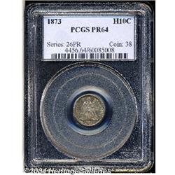 <B>1873<H10C> PR64 PCGS.</B></I> Bright surfaces reveal dappled golden-brown, aqua, lavender, and some deep purple toning. The central motifs are highlighted against the reflective fields, presenting a cameo-like appearance. Sharply struck design elements. The only blemish is a diagonal, shallow pinscratch that traverses the upper central reverse. Population: 64 in 64, 44 finer (9/04). <BR><BR><B>Important notice:</B> Heritage usually auctions material at the rate of 200-250 lots per hour. On some occasions eBay Live bid software or the Internet may not be able to keep up with the pace of the auction. We recommend placing a realistic absentee bid now as insurance to avoid disappointment. Occasionally the auctioneer may eliminate or reject an eBay Live bid, and the auctioneer may also reopen a lot after the close of the eBay live bidding (usually because we missed an audience bid), and may reject your bid even if it shows you as the winning bidder. By bidding via eBay Live, you agree that Heritage may award the lot to another bidder at its sole discretion under the circumstances described above or any other reasonable circumstances. Since eBay bids are not shown to us until we open the lot on the floor, we treat those bids just like floor bids. In most cases the floor responds before the eBay bid is presented to us, due to Internet lag time, so for consistency we have made it a policy that floor bids are always considered first over tie eBay live bids. Also please note that all Heritage lots purchased through eBay Live carry a 20% Buyer's Premium. Please make sure you read the Terms and Conditions before you bid.