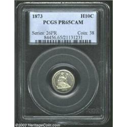 <TR><TD width="100%"><TABLE cellSpacing=1 cellPadding=3 width="100%" border=0><TBODY><TR><TD width="100%" bgColor=#79735c><FONT face=arial color=#ffffff size=3><B>Description</B> </FONT></TD></TR><TR><TD width="100%" bgColor=#ffffff><FONT face=arial size=2><B>1873 H10C PR65 Cameo PCGS.</B></I> Type collectors should take note when this final-year proof crosses the auction block. The well frosted devices are sharply impressed, and neither side reveals any noteworthy handling marks. There are a few wispy die striations (as struck) on each side. Only 600 pieces were produced. Population: 1 in 65 Cameo, 0 finer (4/03). </FONT></TD></TR></TBODY></TABLE></TD></TR></TBODY></TABLE><BR><A name=PricesRealized></A><TABLE cellSpacing=0 cellPadding=0 width="100%" bgColor=#000000 border=0><TBODY><TR><TD width="100%"><TABLE cellSpacing=1 cellPadding=3 width="100%" border=0><TBODY><TR><TD width="100%" bgColor=#79735c><A name=PR><FONT face=arial color=#ffffff size=3><B>Previous Prices from Heritage Auctions</B> </FONT></A></TD></TR><TR><TD bgColor=#f6f6ed><TABLE cellSpacing=0 cellPadding=0 width="100%" border=1><TBODY><TR><TD align=middle width="33%"><B>Date</B></TD><TD align=middle width="33%"><B>Service</B></TD><TD align=middle width="33%"><B>Price</B></TD></TR><TR bgColor=whitesmoke><TD width="33%"><B>03/23/2003</B></TD><TD width="33%">NGC</TD><TD width="33%">$1,380.00</TD></TR><TR bgColor=whitesmoke><TD width="33%"><B>02/23/2001</B></TD><TD width="33%">NGC</TD><TD width="33%">$977.50</TD></TR></TBODY></TABLE></TD></TR><TR><TD bgColor=#ffffff><FONT face=arial size=1 ?>PLEASE NOTE: All prices realized reflect the final hammer price PLUS the buyer's premium in auctions that charge a buyer's premium. Each item has a notation at the top of the listing indicating whether that lot included a buyer's premium. Example: A item that sells with a final hammer price of $100 and a 20% buyer's premium will display with a price realized of $120. All information listed is intended to be as accurate as possible, but errors are possible. Please use this guide carefully and inform us of any inaccuracies. </FONT></TD></TR></TBODY></TABLE></TD></TR></TBODY></TABLE><BR><TABLE cellSpacing=0 cellPadding=0 width="100%" bgColor=#000000 border=0><TBODY><TR><TD width="100%"><TABLE cellSpacing=1 cellPadding=3 width="100%" border=0><TBODY><TR><TD width="100%" bgColor=#79735c colSpan=6><FONT face=arial color=#ffffff size=3><B>Price Guide*</B> </FONT></TD></TR><TR bgColor=#f6f6ed><TD align=middle><B>Grade</B> </TD><TD align=middle><B>Coin World<BR>(Trends)</B> </TD><TD align=middle><B>Numismedia<BR>Retail</B> </TD><TD align=middle><B>Numismedia<BR>Wholesale</B> </TD><TD align=middle><B>Coin<BR>Universe</B> </TD><TD align=middle><B>Heritage<BR>Value Index</B> </TD></TR><TR bgColor=#ffffff><TD align=middle>64</TD><TD align=right>---</TD><TD align=right>---</TD><TD align=right>---</TD><TD align=right>---</TD><TD align=right>$396.00</TD></TR><TR style="FONT-WEIGHT: bold" bgColor=#cccfdd><TD align=middle>65</TD><TD align=right>---</TD><TD align=right>---</TD><TD align=right>---</TD><TD align=right>---</TD><TD align=right>$1,266.00</TD></TR><TR bgColor=#ffffff><TD align=middle>66</TD><TD align=right>---</TD><TD align=right>---</TD><TD align=right>---</TD><TD align=right>---</TD><TD align=right>---</TD></TR><TR bgColor=#ffffff><TD colSpan=6><FONT size=1>*All information listed is intended to be as accurate as possible, but errors are possible. No item may be returned or refused based on this information which is provided as a service to our customers. You should contact each pricing source directly to determine the accuracy of this information. </FONT></TD></TR></TBODY></TABLE></TD></TR></TBODY></TABLE><BR><TABLE cellSpacing=0 cellPadding=0 width="100%" bgColor=#000000 border=0><TBODY><TR><TD width="100%"><TABLE cellSpacing=1 cellPadding=3 width="100%" border=0><TBODY><TR><TD width="100%" bgColor=#79735c><FONT face=arial color=#ffffff size=3><B>Population Guide</B> </FONT></TD></TR><TR bgColor=#ffffff><TD align=middle><!-- Begin Output of Population Grid--><TABLE cellSpacing=0 cellPadding=0 width="100%" border=0><TBODY><TR><TD vAlign=center><TABLE cellSpacing=0 width="100%" border=1 cellsadding="3"><TBODY><TR><TD vAlign=center><TABLE cellSpacing=0 cellPadding=3 width="100%" border=1><TBODY><TR><TD vAlign=center align=middle bgColor=#f0f1e8 colSpan=2 <CENTER><FONT face=Arial size=2><B>PCGS Pop </B></FONT><CENTER></CENTER></TD><TD vAlign=center align=middle bgColor=#f0f1e8 colSpan=2><CENTER><FONT face=Arial size=2><B>NGC Pop</B></CENTER></FONT></TD></TR><TR><TD vAlign=center><FONT face=Arial size=2>(65)</FONT> </TD><TD vAlign=center align=right><FONT face=Arial size=2>1</FONT> </TD><TD vAlign=center><FONT face=Arial size=2>(65)</FONT> </TD><TD vAlign=center align=right><FONT face=Arial size=2>6</FONT> </TD></TR><TR><TD vAlign=center><FONT face=Arial size=2>(>65)</FONT> </TD><TD vAlign=center align=right><FONT face=Arial size=2>0</FONT> </TD><TD vAlign=center><FONT face=Arial size=2>(>65)</FONT> </TD><TD vAlign=center align=right><FONT face=Arial size=2>0</FONT> </TD></TR></TBODY></TABLE></TD></TR></TBODY></TABLE></TD></TR></TBODY></TABLE><!-- End Output of Population Grid--></TD></TR></TBODY></TABLE></TD></TR></TBODY></TABLE><BR><TABLE cellSpacing=0 cellPadding=0 width="100%" bgColor=#000000 border=0><TBODY><TR> Important notice: We expect to be auctioning lots at the rate of 200-250 per hour. On occasion eBay live bid software cannot keep up with the pace of the auctions where 4-5 lots per minute can hammer down, so we recommend that you place a realistic absentee bid now as insurance to avoid disappointment. Also please note that all Heritage/CAA lots purchased through eBay Live carry a 20% Buyer's Premium. Please make sure you read the Terms and Conditions.