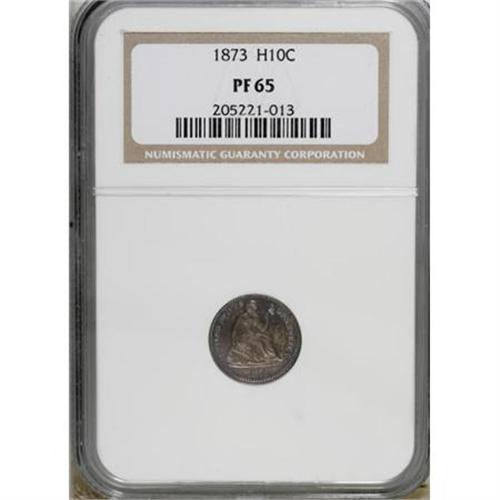 <B>1873 H10C PR65 NGC.</B></I> A lovely Gem proof of the final half dime issue, with pale lilac and iridescent toning, combined with excellent cameo contrast to create a wonderful visual presentation.<BR><BR><B>Coin Engraver:</B> Christian Gobrecht<BR><BR><b>Shipping:</b> Coins & Currency (<a target="_blank" href="http://www.heritageauctions.com/common/shipping.php">view shipping information</a>)