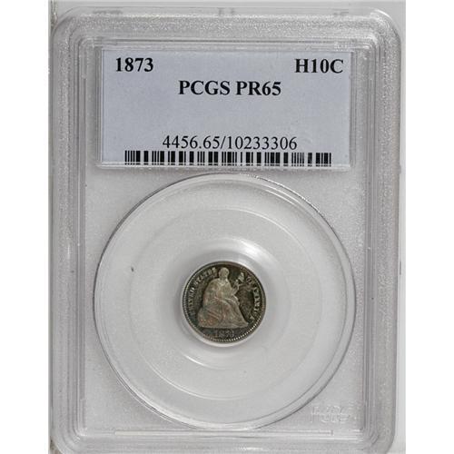 <B>1873<H10C> PR65 PCGS.</B></I> Iridescent cobalt-blue and mauve patination envelopes both sides of this gorgeous Gem proof. Reflective fields and sharply struck design elements are apparent on both sides. A shallow linear mark is noted on Liberty's left (facing) thigh. Population: 34 in 65, 14 finer (7/06).