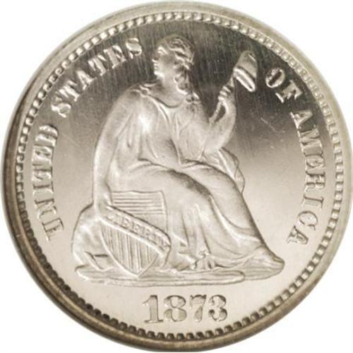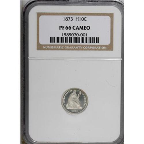 <B>1873 H10C PR66 Cameo NGC.</B></I> Stark cameo contrast is obvious on each side of this high grade specimen. The devices are well frosted and the fields are watery and deep, with noteworthy vertical die polish lines on both obverse and reverse. This issue had a relatively low mintage of 600 pieces, and survivors are scarce in Cameo condition. Census: 4 in 66 Cameo, 4 finer (8/07). <BR><BR><b>Shipping:</b> Coins & Currency (<a target="_blank" href="http://www.heritageauctions.com/common/shipping.php">view shipping information</a>)