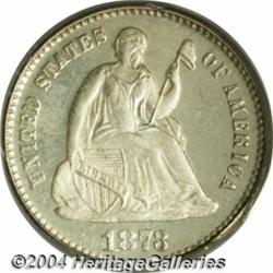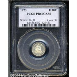<B>1873<H10C> PR66 Cameo PCGS.</B></I> Gray-silver colored with deep reflectivity in the fields and pleasingly pearl-white frosted devices. Upon close inspection, several flaws can be seen atop Liberty and in the right obverse fields that prevent this piece from being tied for the finest known with a Cameo designation. Population: 3 in 66, 1 finer (7/04). <BR><BR><B>Important notice:</B> Heritage usually auctions material at the rate of 200-250 lots per hour. On some occasions eBay Live bid software or the Internet may not be able to keep up with the pace of the auction. We recommend placing a realistic absentee bid now as insurance to avoid disappointment. Occasionally the auctioneer may eliminate or reject an eBay Live bid, and the auctioneer may also reopen a lot after the close of the eBay live bidding (usually because we missed an audience bid), and may reject your bid even if it shows you as the winning bidder. By bidding via eBay Live, you agree that Heritage may award the lot to another bidder at its sole discretion under the circumstances described above or any other reasonable circumstances. Since eBay bids are not shown to us until we open the lot on the floor, we treat those bids just like floor bids. In most cases the floor responds before the eBay bid is presented to us, due to Internet lag time, so for consistency we have made it a policy that floor bids are always considered first over tie eBay live bids. Also please note that all Heritage lots purchased through eBay Live carry a 20% Buyer's Premium. Please make sure you read the Terms and Conditions before you bid. </span></font></tr></table></td></tr></table>