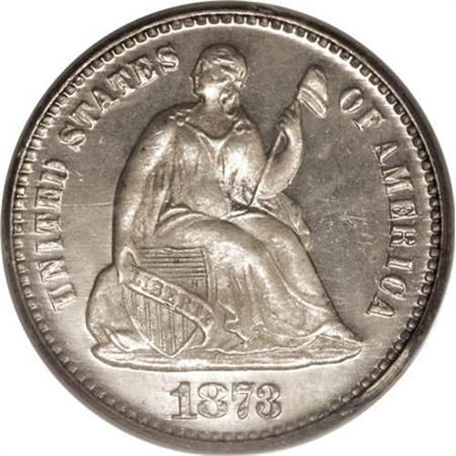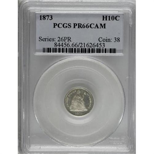 <B>1873 H10C PR66 Cameo PCGS.</B></I> Gray-silver colored with deep reflectivity in the fields and pleasingly pearl-white frosted devices. Upon close inspection, several flaws can be seen atop Liberty and in the right obverse fields that prevent this piece from being tied for the finest known with a Cameo designation. Population: 3 in 66, 1 finer (7/04). <BR><BR><b>Shipping:</b> Coins & Currency (<a target="_blank" href="http://www.heritageauctions.com/common/shipping.php">view shipping information</a>\)