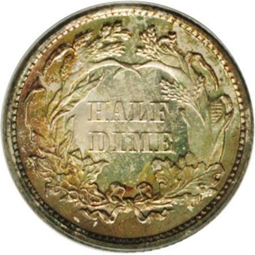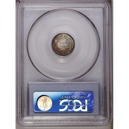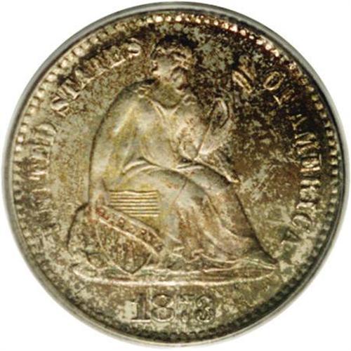 <B>1873<H10C> PR66 PCGS.</B></I> Lovely orange, rose, and lime toning endows this suitably struck and flashy Premium Gem. For the final year of the denomination, only Closed 3 proof half dimes were struck, unlike the two cent piece, which was also abolished in 1873 but later restruck with an Open 3 logotype. A scant 600 proofs were struck, most of which lack the eye appeal of the present piece. Population: 11 in 66, 3 finer (2/06).