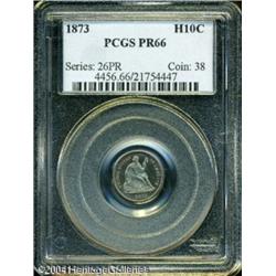 1873 H10C PR66 PCGS. Lovely rose and gold patina f <B>1873 H10C PR66 PCGS.</B></I> Lovely rose and gold patina frames the sea-green obverse center, while the reverse is vividly toned in dappled orange-red and apple-green colors. A well struck and exquisitely struck specimen from the final year of the denomination. Just 600 proofs were produced. Population: 11 in 66, 3 finer (10/04). <BR><BR><B>Important notice:</B> Heritage usually auctions material at the rate of 200-250 lots per hour. On some occasions eBay Live bid software or the Internet may not be able to keep up with the pace of the auction. We recommend placing a realistic absentee bid now as insurance to avoid disappointment. Occasionally the auctioneer may eliminate or reject an eBay Live bid, and the auctioneer may also reopen a lot after the close of the eBay live bidding (usually because we missed an audience bid), and may reject your bid even if it shows you as the winning bidder. By bidding via eBay Live, you agree that Heritage may award the lot to another bidder at its sole discretion under the circumstances described above or any other reasonable circumstances. Since eBay bids are not shown to us until we open the lot on the floor, we treat those bids just like floor bids. In most cases the floor responds before the eBay bid is presented to us, due to Internet lag time, so for consistency we have made it a policy that floor bids are always considered first over tie eBay live bids. Also please note that all Heritage lots purchased through eBay Live carry a 20% Buyer's Premium. Please make sure you read the Terms and Conditions before you bid. This lot is being auctioned in conjunction with a live floor auction by Heritage Galleries & Auctioneers. All final auction and invoice information will be supplied by Heritage Galleries & Auctioneers, and all other information should be considered preliminary. Lot:5698