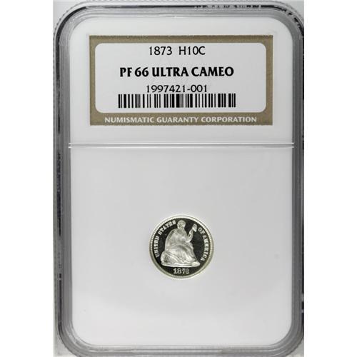 <B>1873<H10C> PR66 Ultra Cameo NGC.</B></I> A nicely struck and fully untoned Gem that has extraordinary contrast and attractive, mark-free surfaces. Only 600 pieces were originally struck and this has to be one of the finest remaining.