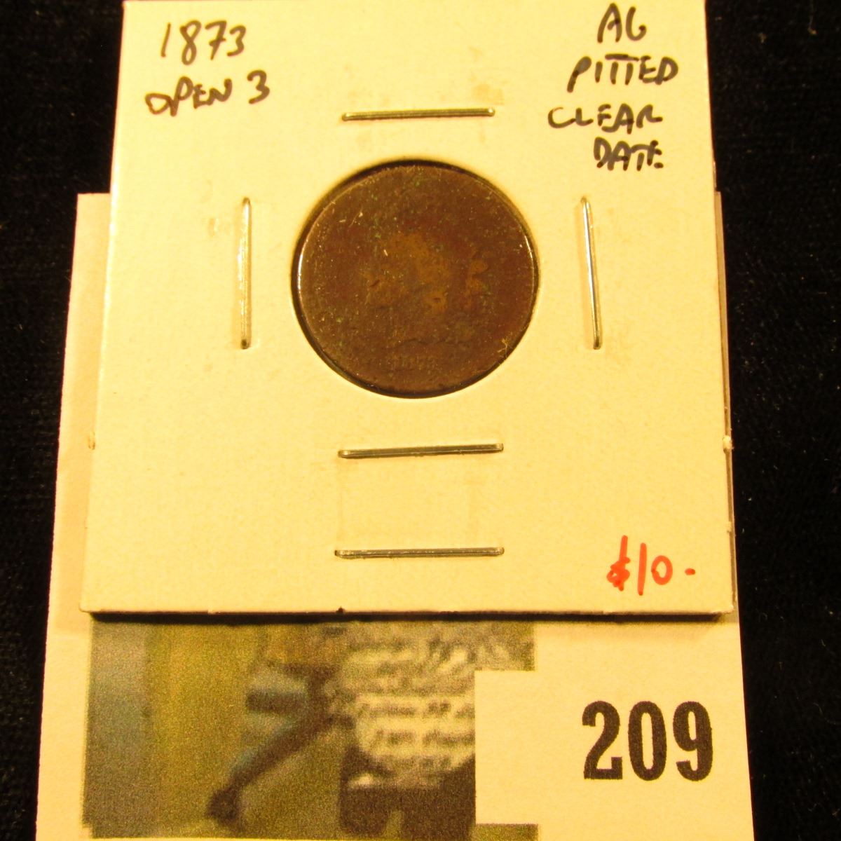 1873 Indian Cent, AG pitted, clear date, value $10