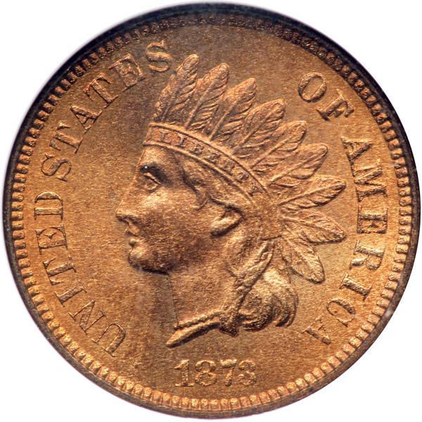 1873 Indian Head Cent. Closed 3. NGC graded MS-66 Red & Brown. Accompanied by an Eagle Eye certificate. Lots of mint red, indeed the surface is loaded with vibrant color, while devices are noticeably finer than usual for this year's mintage. Scarce with the Closed 3. Pop 5; none finer at NGC .