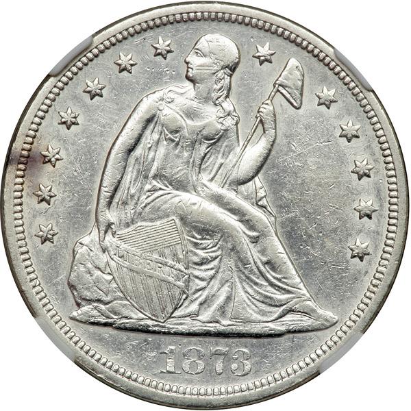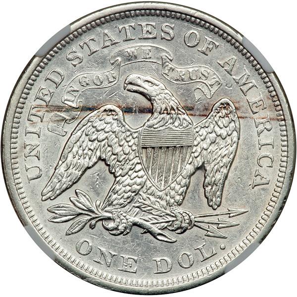 1873 Liberty Seated Dollar. NGC graded AU-53. Untoned with a reverse toning streak. Probably removable. Pop 8; 98 finer.