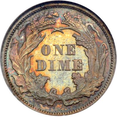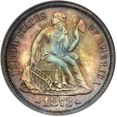 1873 Liberty Seated Dime. Arrows. NGC graded Proof 65. Nicely toned on both sides. Only 800 struck. A lustrous Gem that has exquisite surfaces and a very impressive strike, indeed, the meticulous detail on every device is, well, rather striking even for a Proof issue of this year. The arrows at the date were to allow the Treasury department to find and withdraw the "old tenor" pre Coinage Act of 1873 silver from circulation for reminting into coins issued at the new standard. Proofs were struck in limited numbers; only a handful of Gem Proofs remain. Pop 14; 8 in 66; 3 in 67.
