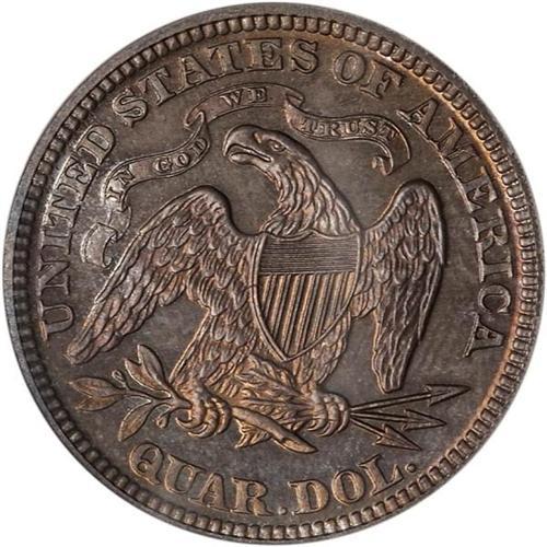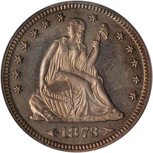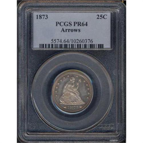 <b>1873 Liberty Seated Quarter Dollar. Arrows. PCGS graded Proof 64.</b> Medium toned, yet basically fresh in appearance. The few wispy hairlines do not detract from the overall pleasing eye appeal of this choice Proof with Arrows seated Liberty quarter dollar <b>(PCGS # 5574)</b>